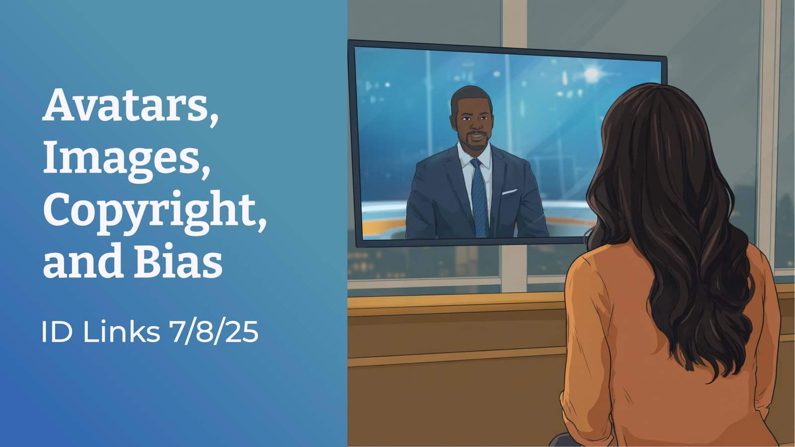 As I read online, I bookmark resources I find interesting and useful. I share these links about once a month here on my blog. This post includes links related to AI video avatars, AI image generation and editing, research on how graphics affect learning, copyright and bias related to AI, and tools and templates for creating scenarios and other elearning.