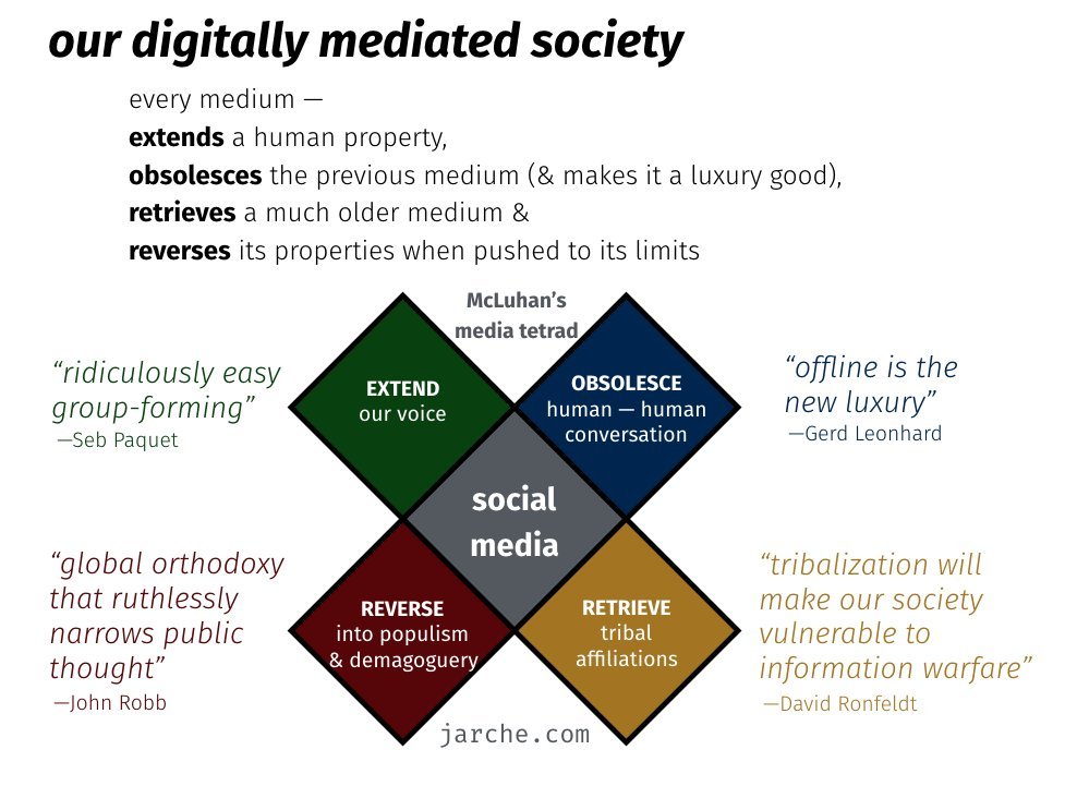 In 2018 — seeing the figure through the ground — I used the Laws of Media developed by Marshall and Eric McLuhan to examine the impact of social media. McLuhan’s Laws state that every medium (technology) used by people has four effects. Every medium extends a human property, obsolesces the previous medium (& often makes it a luxury good), retrieves a much older medium, and reverses its properties when pushed to its limits. These four aspects are known as the media tetrad.