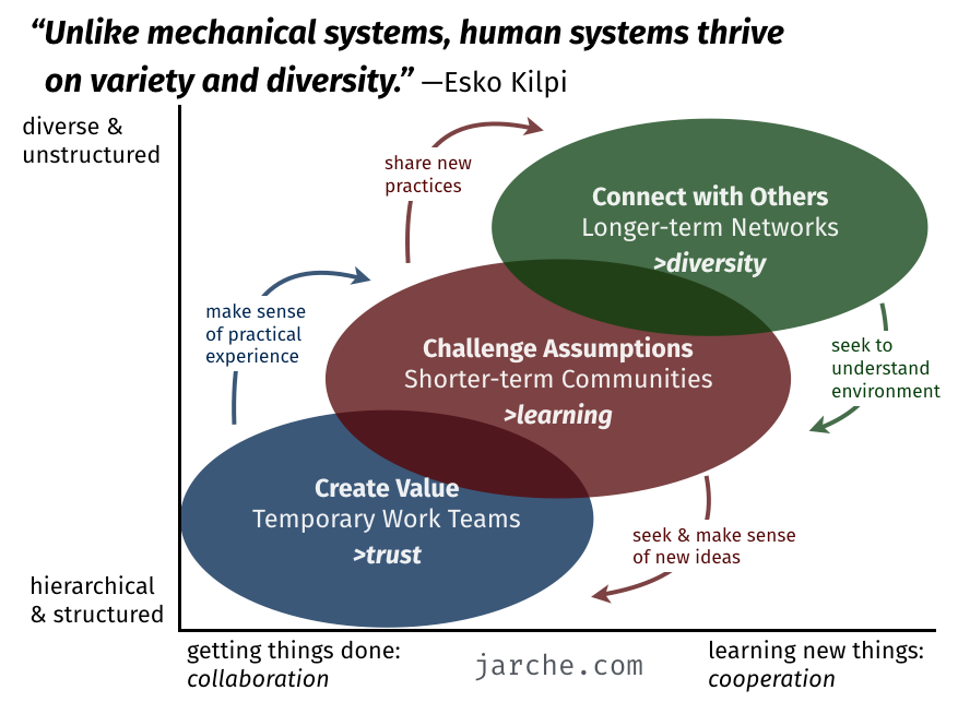 Over-classification and the limitations of field boundaries may not be the best ways to understand complex relationships. In the personal knowledge mastery framework, diversity is key to sensemaking — diversity > learning > trust. Seeking knowledge networks, active sense-making, and public sharing, are practices that need to be widespread. This is how we can deal with ambiguity and complexity.