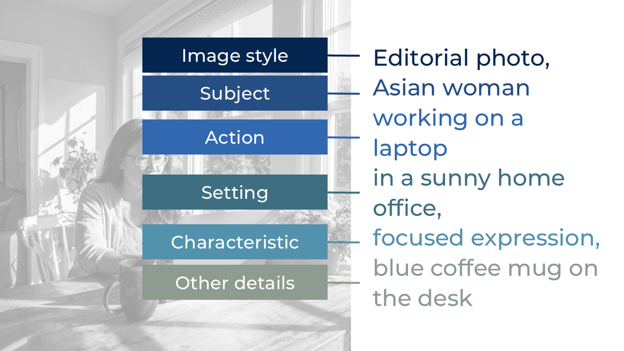 When you work with LLMs like ChatGPT, long, complex prompts with lots of context and detail are often more effective than simple prompts. But when you work with AI image generation tools, those long prompts often don’t work as well. Most image generation tools give better results with simpler prompts rather than long paragraphs. I use a standard prompt structure for AI image generation. The structure isn’t strict; I shift elements around depending on what’s most important. In my experience, this prompt structure works well across multiple AI image tools.